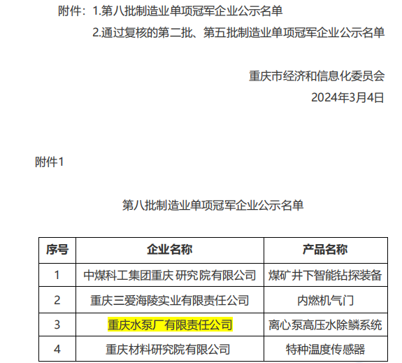 近日,工業(yè)和信息化部公布了第八批制造業(yè)單項(xiàng)冠軍企業(yè)名單,重泵公司成功入選,成為本批重慶入選的4家企業(yè)之一,實(shí)現(xiàn)了重慶機(jī)電集團(tuán)在國(guó)家級(jí)制造業(yè)單項(xiàng)冠軍企業(yè)中“零突破”。這是繼公司獲得國(guó)家技術(shù)創(chuàng)新示范企業(yè)、國(guó)家專精特新“小巨人”企業(yè)等工業(yè)和信息化領(lǐng)域的榮譽(yù)后,再次獲得又一項(xiàng)國(guó)家級(jí)榮譽(yù)。